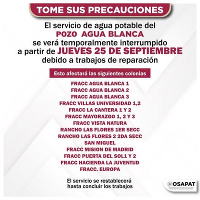 ¡ATENCIÓN! El pozo de ‘Agua Blanca’ será reparado el jueves 25. El servicio de agua será temporalmente suspendido para algunas colonias.