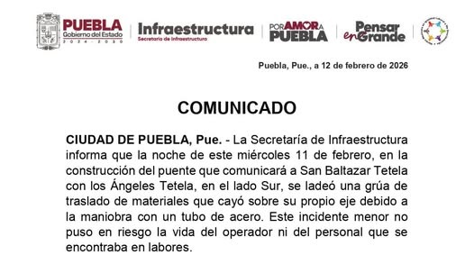 Ciudad de Puebla, Pue.— La Secretaría de Infraestructura informó que la noche del miércoles 11 de febrero se registró un incidente menor durante los trabajos de construcción del puente que conectará a San Baltazar Tetela con Los Ángeles Tetela, en el lado sur de la obra.
