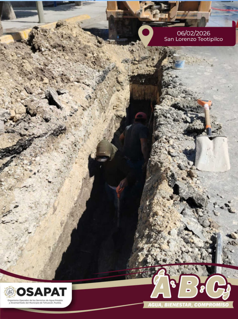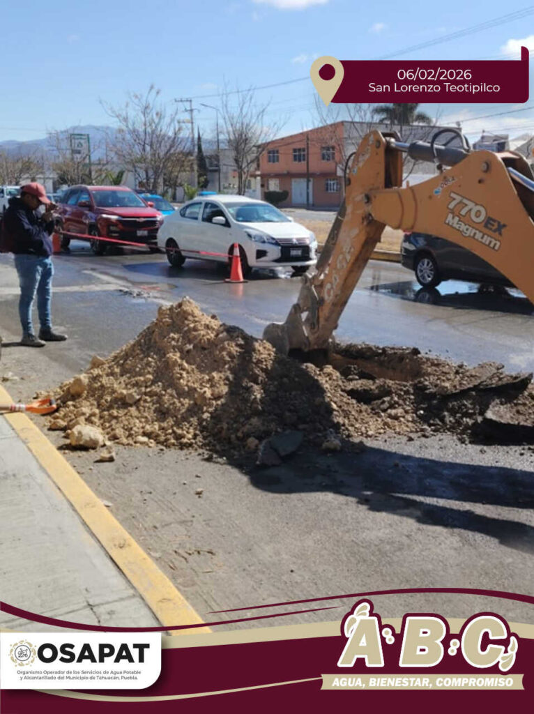 Tehuacán, Puebla.— Como parte de las acciones permanentes para garantizar el abasto y correcto funcionamiento de la red hidráulica, el Organismo Operador de los Servicios de Agua Potable y Alcantarillado de Tehuacán (OOSAPAT) informó que este día se atendió y reparó una fuga de agua en la junta auxiliar de San Lorenzo Teotipilco.