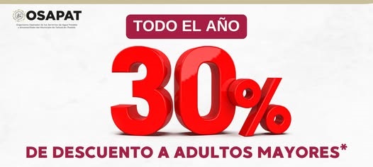 Tehuacán, Puebla.— El Organismo Operador de los Servicios de Agua Potable y Alcantarillado de Tehuacán (OOSAPAT) informó que durante todo el año las personas adultas mayores que sean titulares del servicio pueden acceder a un 30 por ciento de descuento en su recibo de agua.