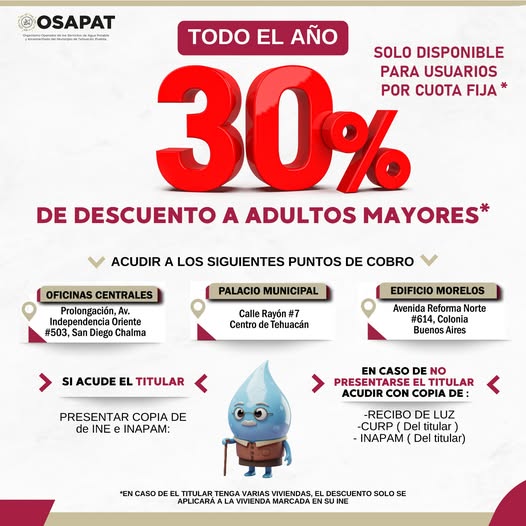 El Organismo Operador del Servicio de Agua Potable y Alcantarillado de Tehuacán (OOSAPAT) informó que, durante todo el año, las personas adultas mayores que sean titulares del servicio pueden acceder a un 30 por ciento de descuento en su recibo de agua potable.