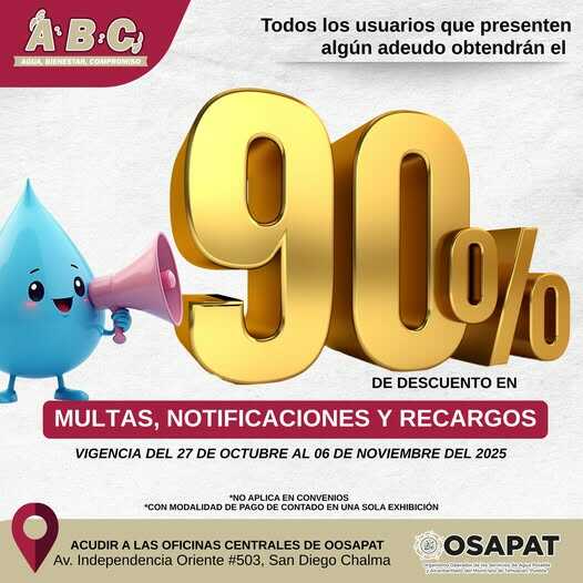 El Organismo Operador del Servicio de Agua Potable y Alcantarillado de Tehuacán (OOSAPAT) anunció un descuento del 90% en multas, notificaciones y recargos, con el objetivo de apoyar a los usuarios a regularizar su situación y fomentar el cumplimiento oportuno de sus obligaciones.