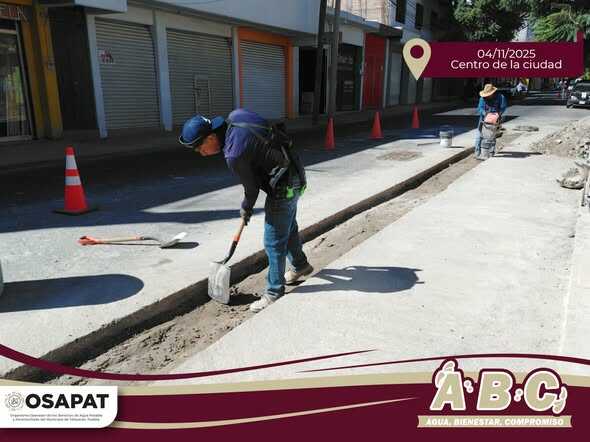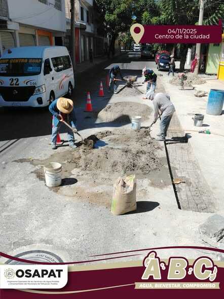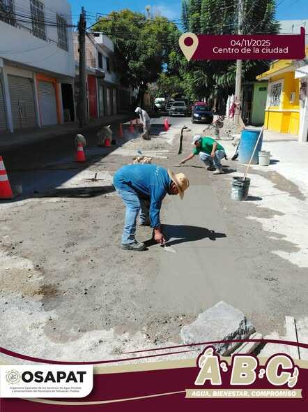 El OOSAPAT informó que este lunes se llevaron a cabo trabajos de reposición de concreto en calles del Centro de la ciudad, como parte de las acciones permanentes de rehabilitación que realiza el organismo tras intervenciones en la red hidráulica y sanitaria.